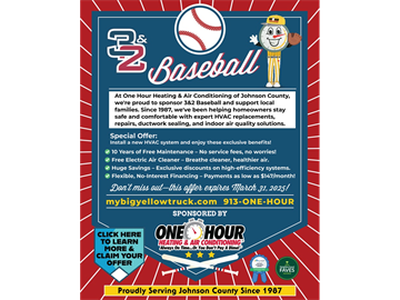 If you like doing business with companies that truly support your kids through their schools and sports, give One Hour Heating & Cooling a shot at this or any of your HVAC needs. They are an award-winning outfit in business right here since 1987. Dozens of their technicians and staff have kids playing in the 3&2 program so from the ownership… to the shop… to the friendly office staff, these are your friends and neighbors you can trust with an HVAC project. Offer ends at the end of March so check out the website and give them a call soon (913) ONE-HOUR.