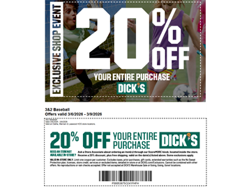Pre-Season Shop Weekend at Dick's Sports 20% off Any Purchase March 6-9.